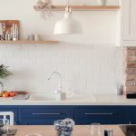 The bunk room in the beach house is filled with Greek island vibes with the mix of blue and white as well as tassled stripes of throw blankets and a rattan pendant light. Making the most of the high levels, an idyllical staircase ascends to a third story equipped with window that fill the room with light.